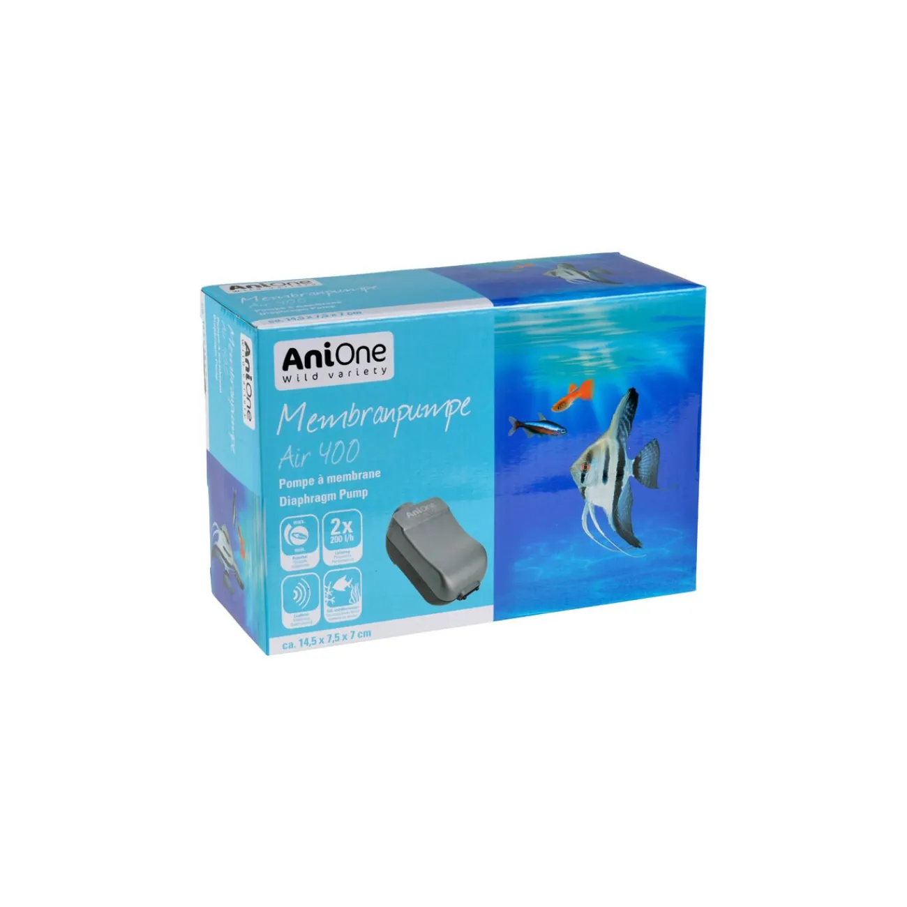 Volt : 230 V/50 HzWatt 4l/h : 2 x 200Sortie : 2Aquarium 50 – 200 LDiamètre de tuyau : 4 – 6 mm Pour la mise en service de la pompe, nous recommandons les tuyaux à air, les diffuseurs d’air et les clapets antiretour AniOne L’installation d’un clapet antiretour est conseillée Placez la pompe à membrane en dehors de l’aquarium. Convient pour aquariums d’eau douce et d’eau de mer