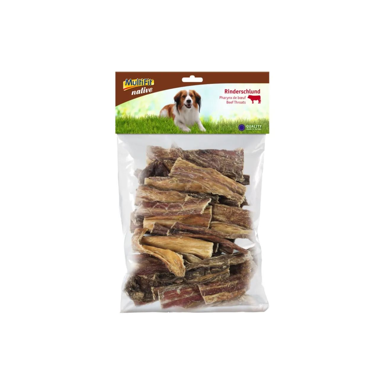Riche en protéines animales, minéraux et oligo-éléments. Facile à digérer, car déshydraté avec soin. Les morceaux de pharynx de bœuf MultiFit native conviennent aux chiots.