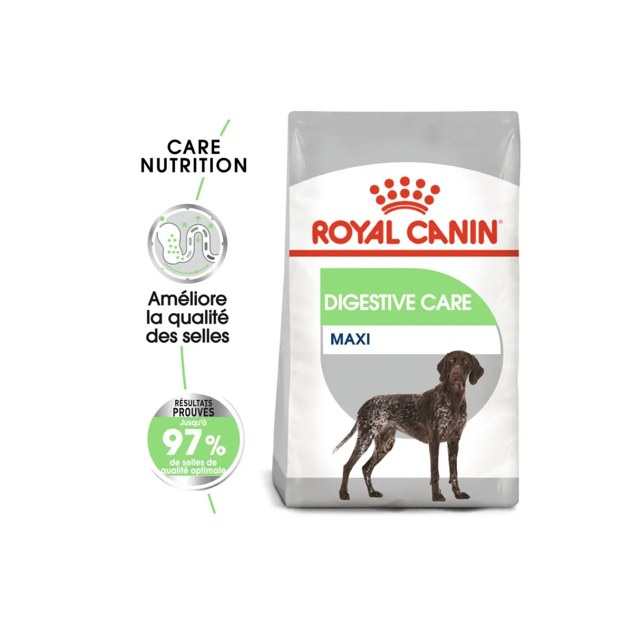 Faites-nous confiance : Dans les études internes de Royal Canin, une amélioration de la qualité des selles a été constatée dans 97 % des cas après l’alimentation avec Digestive Care Maxi, ce qui indique clairement un intestin sain. Royal Canin Digestive Care Maxi contribue ainsi au développement de selles de bonne qualité.