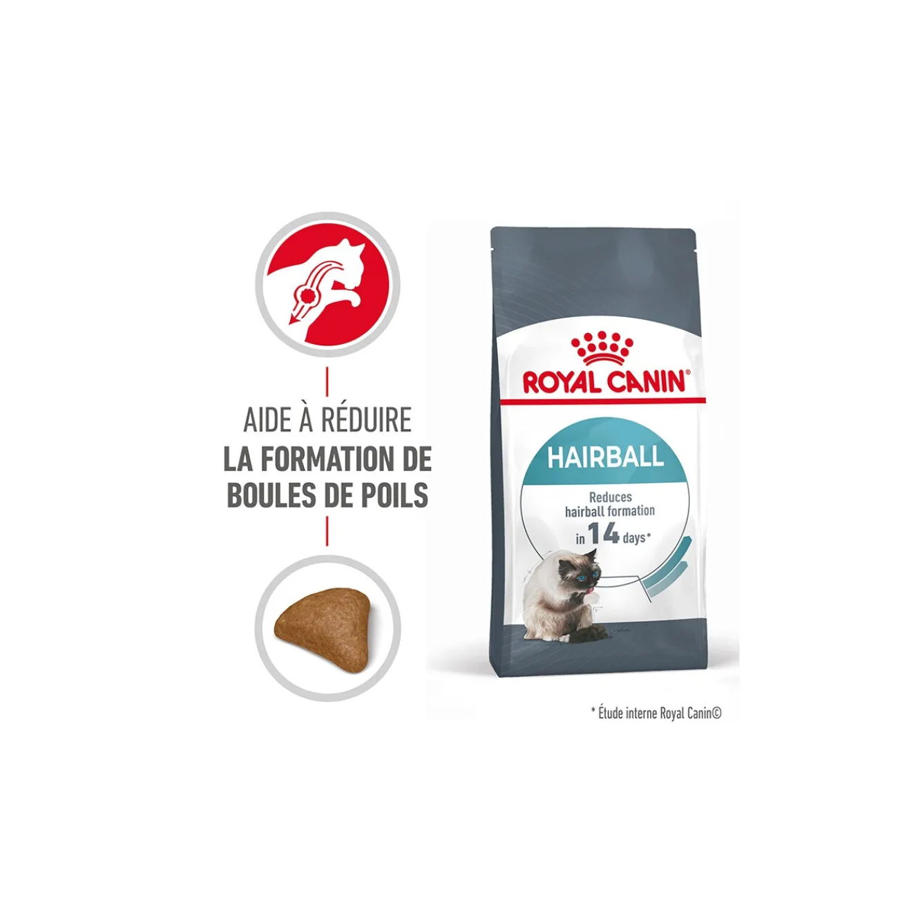 L’alimentation de votre chat joue un rôle important dans sa santé. La gamme ROYAL CANIN® Feline Care Nutrition comprend des aliments spécialement conçus pour répondre aux sensibilités les plus courantes de votre chat.Les chats passent une grande partie de leur journée à se toiletter et avalent donc une grande quantité de poils. Ces poils avalés peuvent s’accumuler dans le tube digestif et former des boules de poils qui peuvent être soit vomies, soit éliminées avec les selles. Chez certains chats, les poils accumulés entraînent un malaise et des sensibilités plus graves.ROYAL CANIN® Hairball Care est une formule complète et équilibrée, spécialement conçue pour réduire la formation de boules de poils. Grâce à un mélange spécial de fibres naturelles (dont le psyllium), ROYAL CANIN® Hairball Care contribue à stimuler naturellement le transit intestinal. Cela permet aux poils avalés d’être plus facilement éliminés avec les selles, au lieu d’être régurgités.Cet aliment contient également une quantité équilibrée de minéraux pour soutenir la santé des voies urinaires de votre chat adulte.ROYAL CANIN® Hairball Care a fait ses preuves. Notre étude* a montré que cet aliment réduisait la formation de boules de poils chez les chats participants en seulement 14 jours.ROYAL CANIN® Hairball Care est également disponible en 2 textures humides différentes : Morceaux fins en sauce et Morceaux fins en gelée . Un mélange d’aliments humides et secs apporte la variété que les chats aiment. Alors que les aliments secs ont un effet nettoyant sur les dents et sont plus faciles à stocker, la teneur en humidité des aliments humides favorise l’hydratation et la santé des voies urinaires.Tous les produits ROYAL CANIN® sont soumis à une procédure de contrôle de qualité approfondie afin de garantir la meilleure qualité. Lorsque votre chat mange ROYAL CANIN® Hairball Care, il reçoit une alimentation complète et équilibrée.*Étude interne de Royal Canin