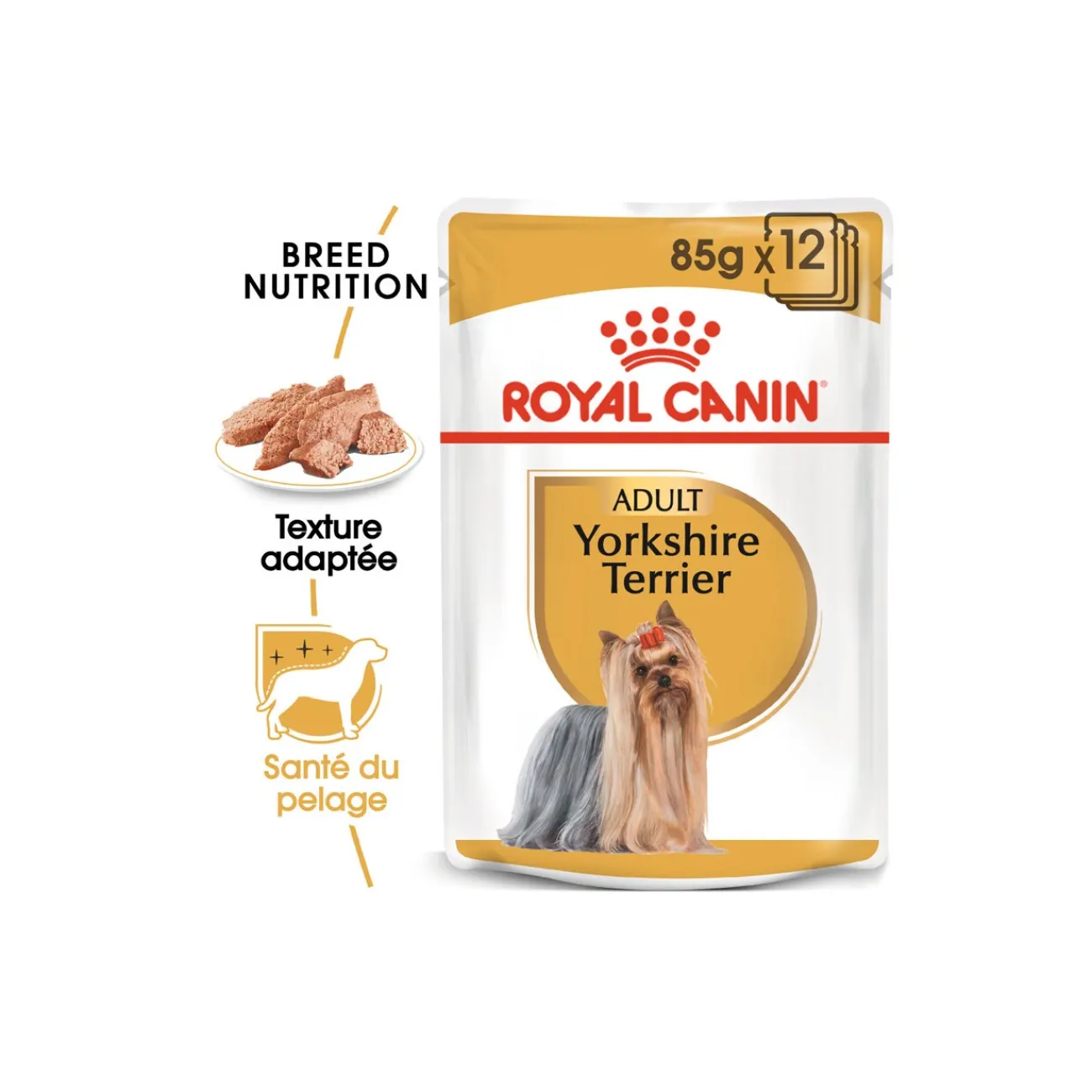 Royal Canin Yorkshire Terrier Mousse convient aux Yorkshire terriers à partir de 10 mois et a été spécialement adaptée aux besoins des Yorkies adultes. La mousse favorise une peau saine et un poil long et soyeux. La formule unique favorise également une digestion saine.