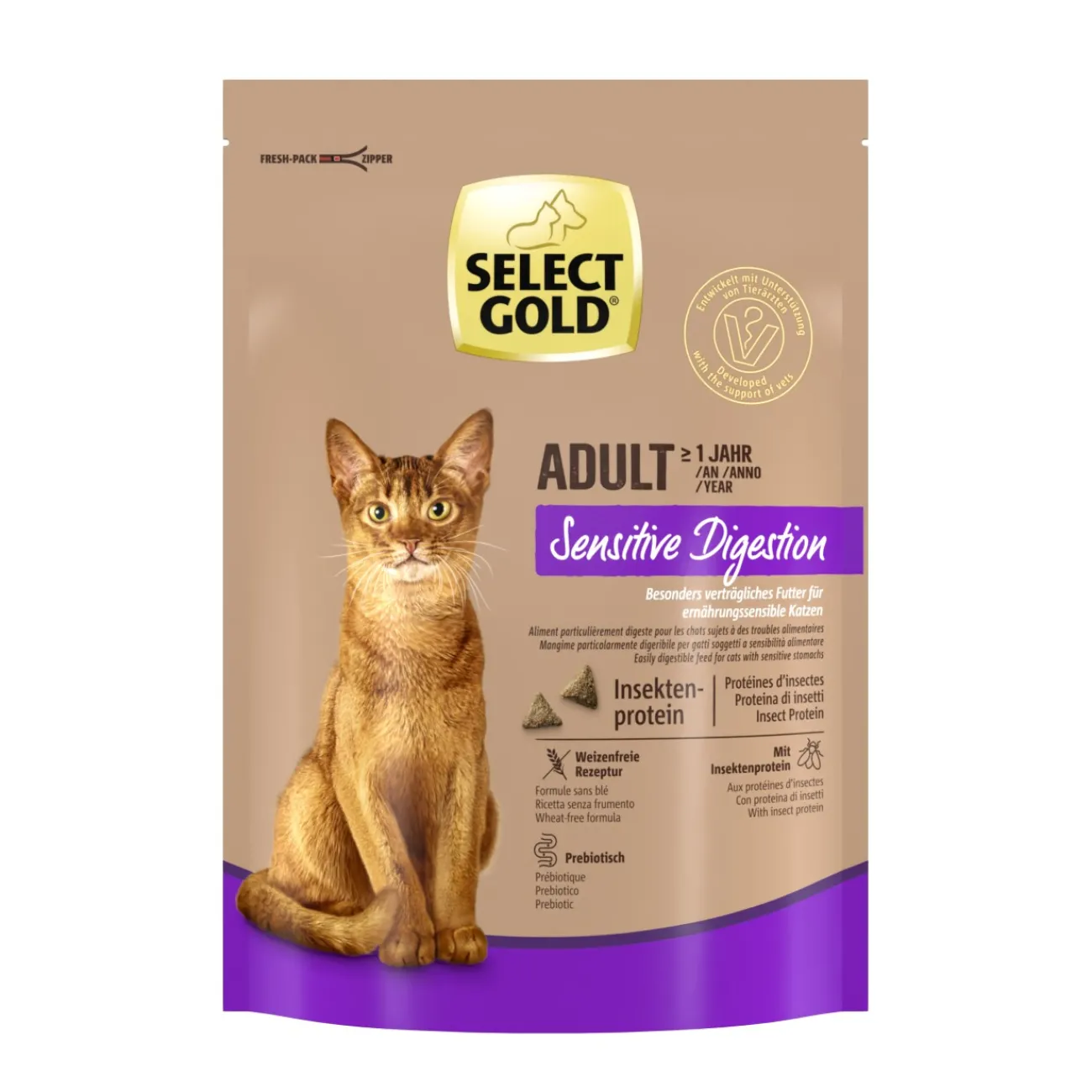 SELECT GOLD Sensitive Adult protéines d’insectes est une nourriture sèche premium équilibrée – Aliment complet pour les chats adultes à partir d’environ 12 mois. mois environ. Cette nourriture sèche de qualité supérieure sans blé est fabriquée en utilisant des protéines d’insectes, elle est, grâce à sa composition spéciale, parfaitement adaptée aux chats sujets à des troubles digestifs. Lors du développement de cette formule premium, les exigences physiologiques des chats adultes ont été prises en compte de manière ciblée.