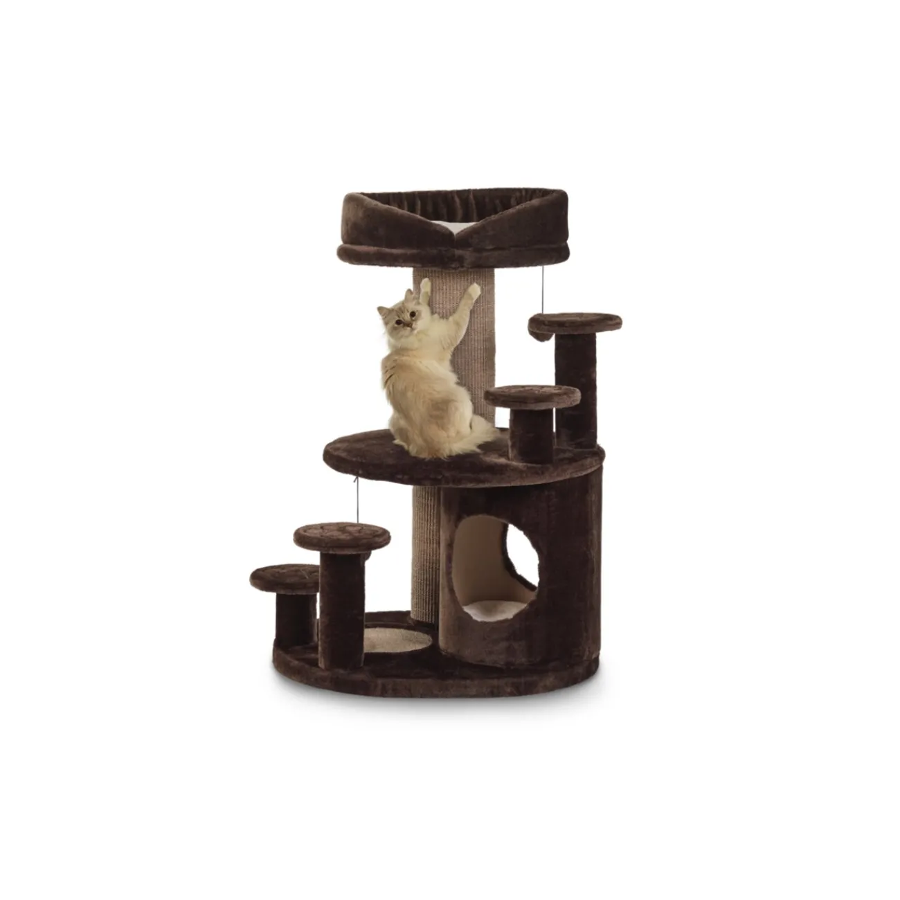 Les quatre éléments rembourrés d’aide à l’accès caractérisent cet arbre à chat et permettent aux chats même les plus vieux d’atteindre facilement les niveaux supérieurs. Le gros tronc, enveloppé de sisal naturel, ainsi que la surface à griffer du socle, satisfont le besoin de griffer naturel de votre petit fauve. Les plateaux de repos rembourrés offrent une vue exceptionnelle et invitent à s’y prélasser. La grotte avec coussin réversible est le lieu de refuge idéal et douillet. La grand plateau de repos supérieur dispose également d’un lit douillet amovible.