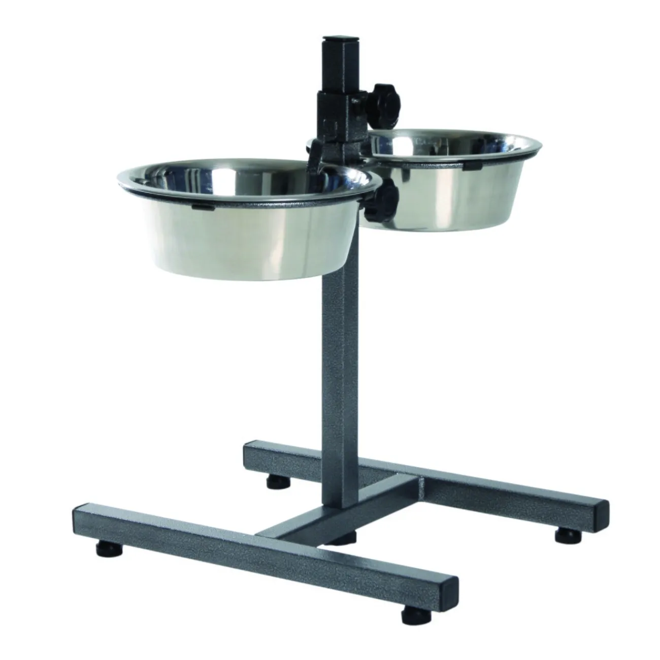 La hauteur de la gamelle en acier inoxydable se règle facilement à l’aide d’un dispositif de blocage. Le bar à chien dispose d’un clapet de protection en métal avec une peinture à l’aspect coup de marteau. Le pied en forme de H, ainsi que les pieds en caoutchouc antidérapants offrent une grande stabilité.
