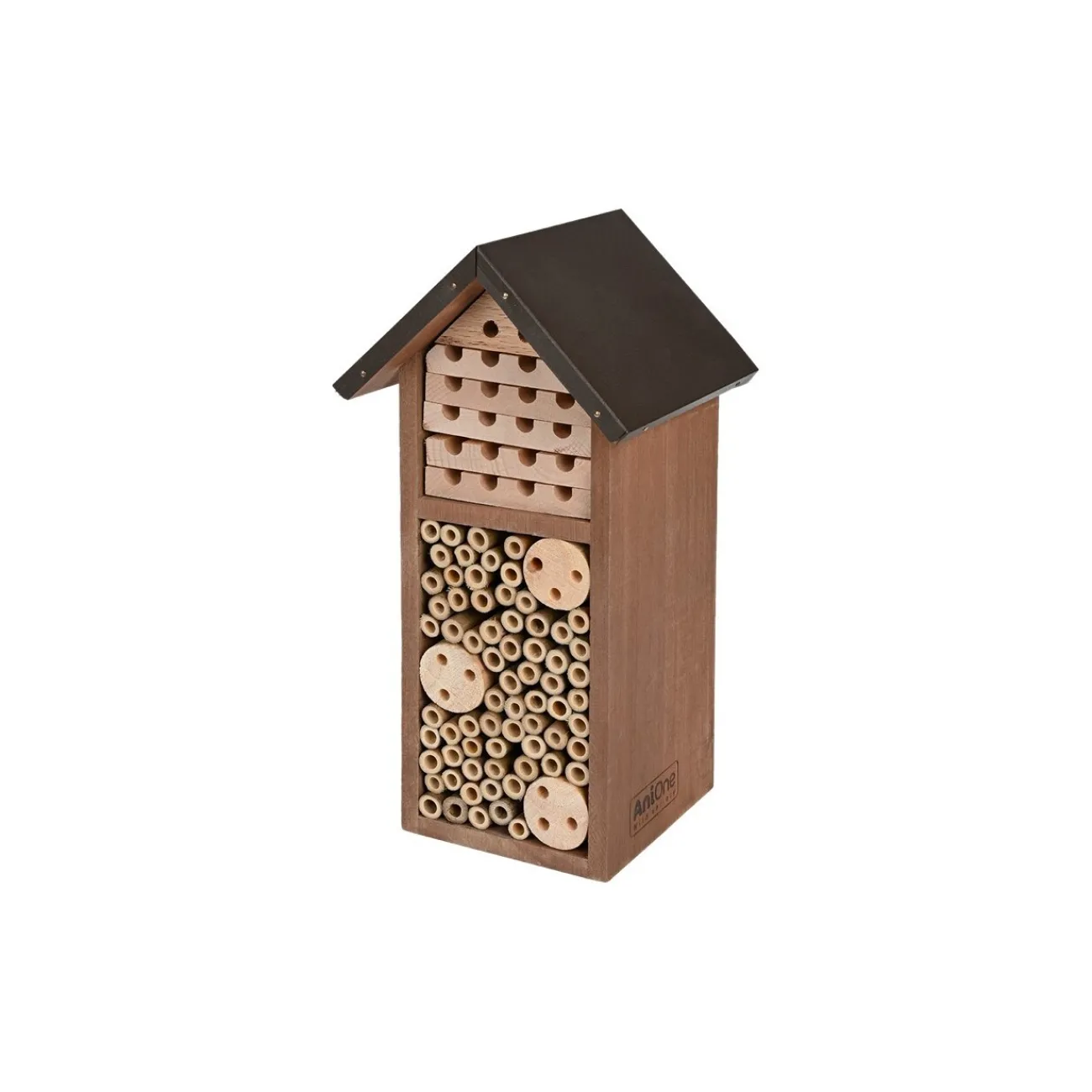 Le nichoir rempli de tiges de bambou est fabriqué en bois dur et soutient ainsi les abeilles sauvages et autres insectes qui contribuent de manière importante à la pollinisation. Les bords lisses augmentent les chances d’une colonisation et le toit métallique protège contre les intempéries.