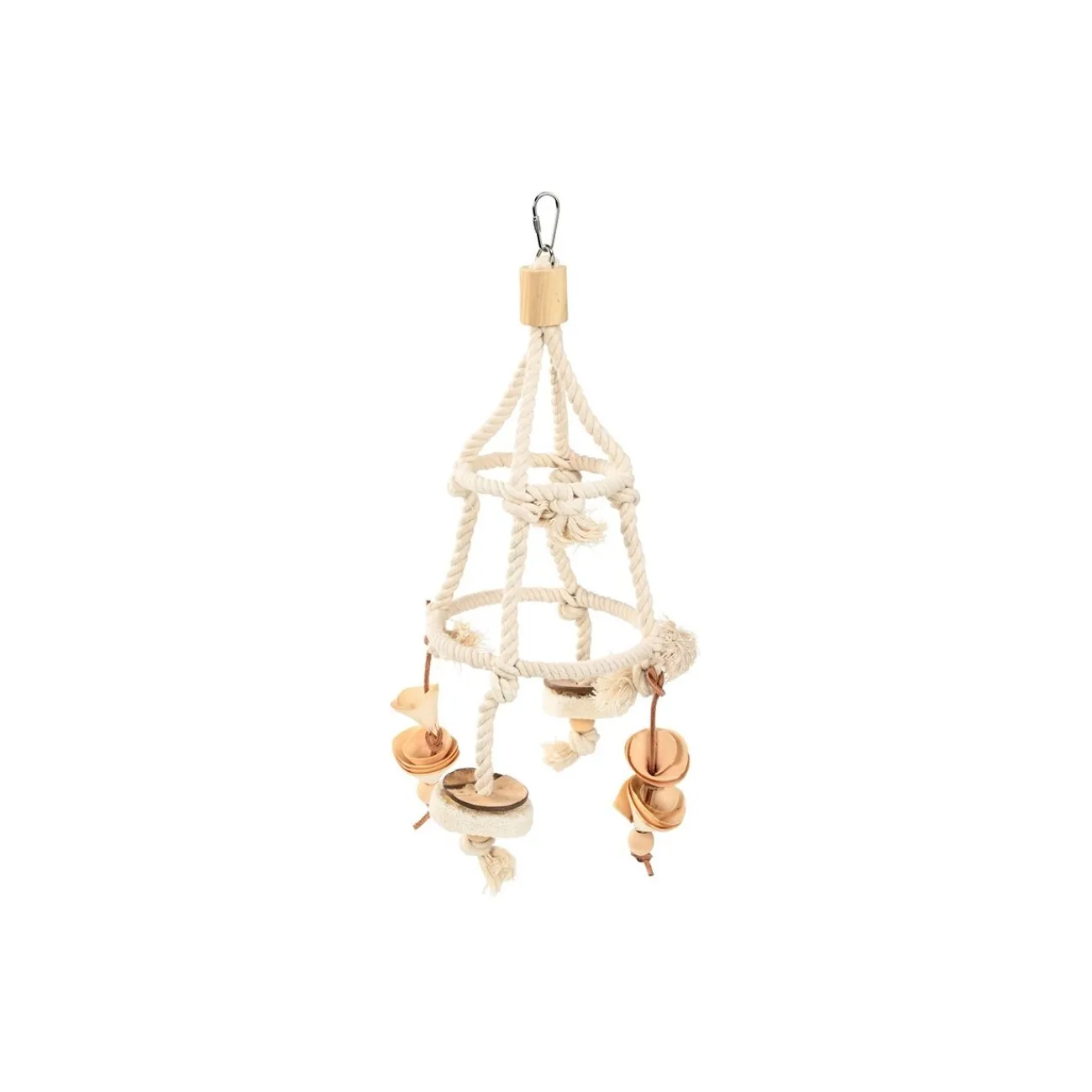 Il se compose de matériaux naturels et offre ainsi un grand plaisir d’escalade avec beaucoup de variété. Grâce au mousqueton intégré , la tour d’escalade est facile à placer dans la cage.