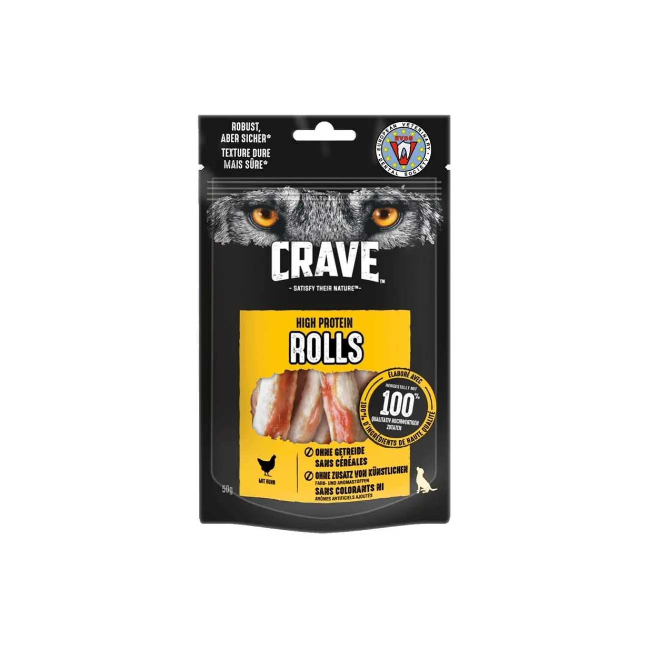 Distribuez votre chien avec CRAVE™ Protein Rolls : Friandises pour chiens à base de protéines animales de premier choix et sans colorants, arômes ou conservateurs artificiels – pour un goût que les chiens adorent instinctivement.
