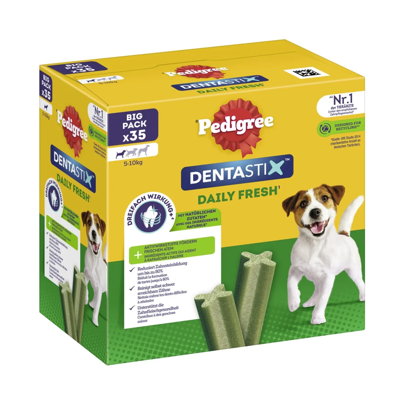 Les os à mâcher spéciaux pour la fraîcheur quotidienne sont des produits de soins dentaires uniques en forme de X qui ont prouvé scientifiquement réduire la formation de tartre jusqu’à 80 % pour une administration quotidienne. PEDIGREE® DENTASTIX™ Daily Fresh contient un mélange unique de principes actifs à base d’extrait de thé vert et d’huile d’eucalyptus brevetée qui contribue à rafraîchir l’haleine. Ils sont délicieux, allégés en matières grasses et sans colorants ni arômes artificiels et ne contiennent pas de sucre ajouté.
