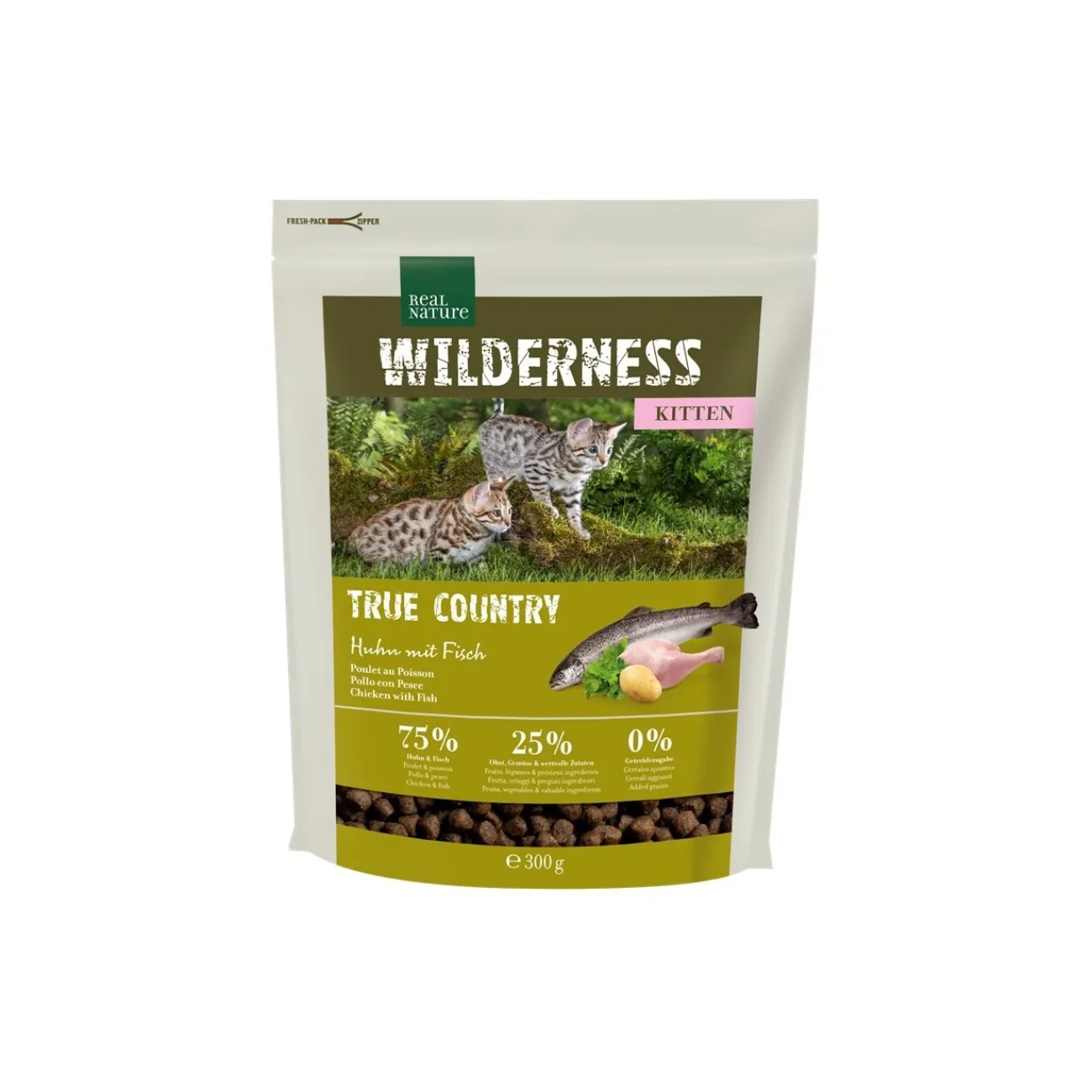Cette recette REAL NATURE WILDERNESS se compose de 75 % de poulet et de poisson de qualité supérieure, de 25 % de fruits, légumes et herbes aromatiques et de 0 % de céréales.