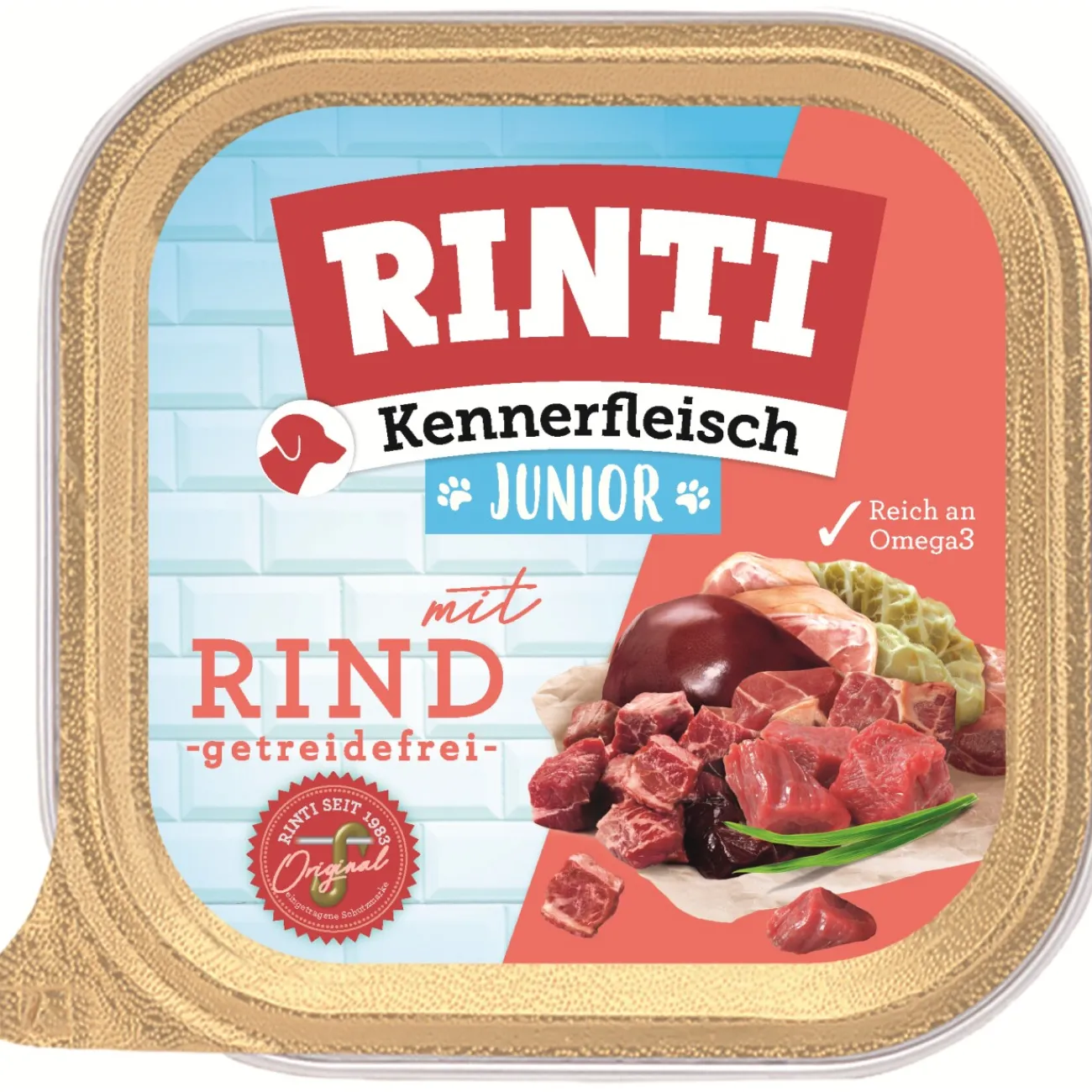 RINTI Kennerfleisch Junior avec différentes variétés, désormais également en bols de 300g. Les bols RINTI Kennerfleisch sont désormais équipés de la formule originale Kennerfleisch. Aliment complet pour chiens en pleine croissance.