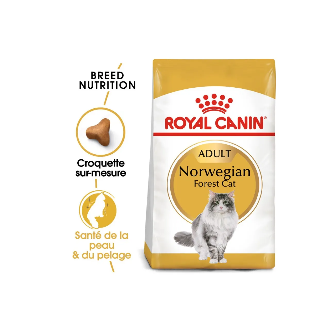 ROYAL CANIN Norwegian Forest Cat Adult est spécialement adapté aux besoins nutritionnels du chat des forêts norvégiennes. Les croquettes à trois branches ont été développées en tenant compte des fortes mâchoires du chat des forêts norvégiennes. Ils encouragent une mastication intensive et prolongée, ce qui favorise l’hygiène bucco-dentaire.