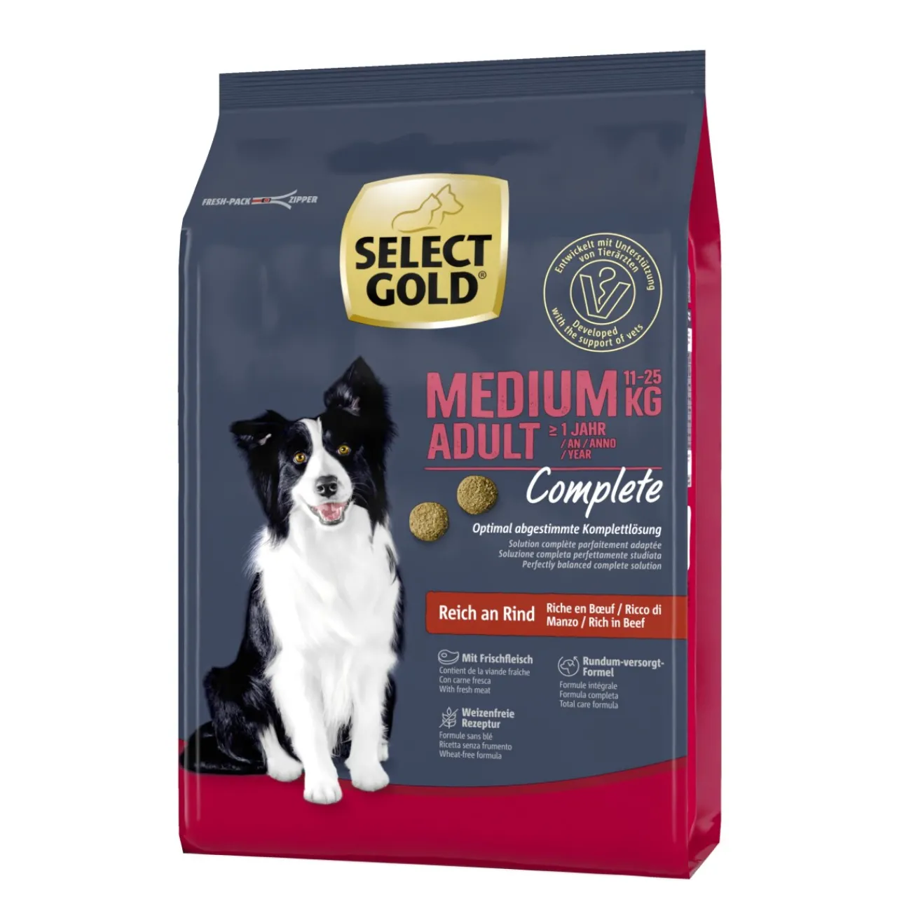 SELECT GOLD Complete Medium Bœuf est un aliment premium équilibré, spécialement mis au point pour les chiens adultes de taille moyenne (poids de 11 à 25 kg) et à partir du 12ème mois environ.