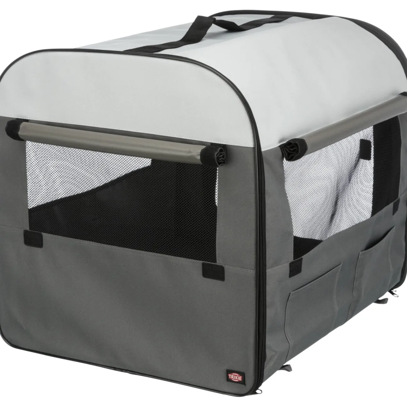 La cage de transport en nylon résistant possède une porte avec une fermeture zippée se refermant complètement.