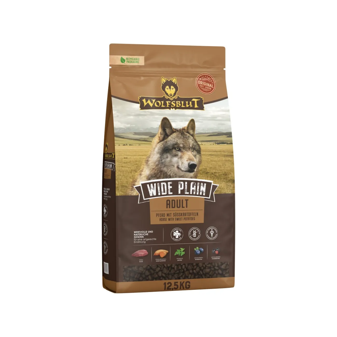 WIDE PLAIN ADULT offre à votre chien une délicieuse combinaison de viande de cheval fraîche, de patates douces riches en nutriments et de superaliments sélectionnés, idéale pour une alimentation naturelle et bien tolérée.